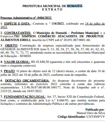 No Diário Oficial estão reunidas respectivamente extratos com as empresas: HIPER COMERCIO, NALDOMIRO F. MACIEL, I.F SOUZA, TIO SIMPSON, A FERREIRA PINHEIRO, MINAS PÃO PADARIA e SANA SERVTCH PEÇAS E ACESSÓRIOS AUTOMOTIVOS. Apesar de citar que as empresas são vencedoras, os extratos não detalham itens e nem valores por unidade.