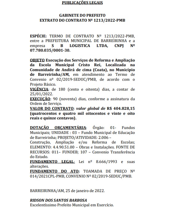 Pela bagatela de R$ 1.392.451,54 a SB Construções reforma outra escola em Barreirinha, essa com recursos da prefeitura, os contratos foram assinados no dia 14 de novembro pelo prefeito interino Ridson dos Santos Barbosa (PP).