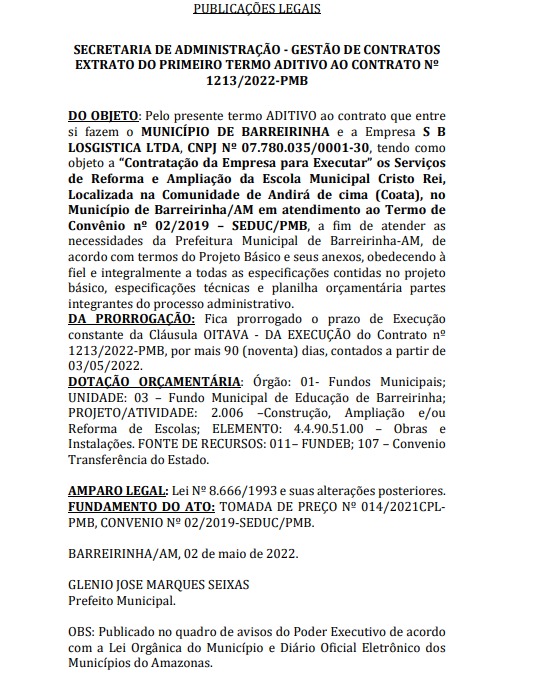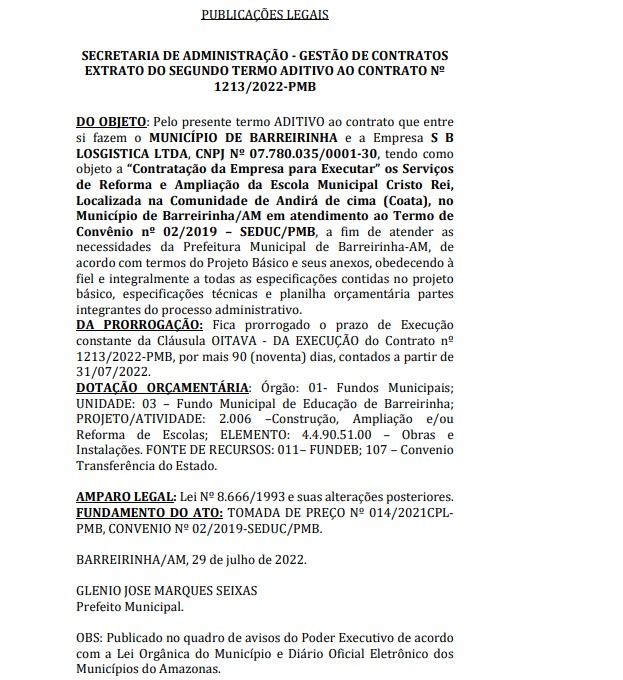 “Fica prorrogado o prazo de Execução constante da Cláusula OITAVA – DA EXECUÇÃO do Contrato no 1213/2022-pmb, por mais 90 (noventa) dias, contados a partir de 26/01/2023 e 180 (cento e oitenta) de prazo de Vigência Contratual constante na Clausula Vigésima Primeira”, cita trecho da peça com assinatura do prefeito Glênio Seixas (MDB).
