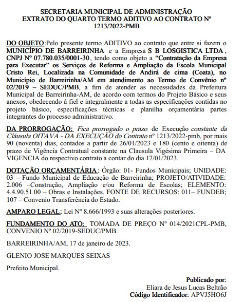 A prefeitura do município de Barreirinha tem reformado, desde janeiro de 2022, uma escola na comunidade de Andirá de Cima por meio de uma contratação que teve o valor inicial de pouco mais de R$ 400 mil, mas já passou por aditivos contratuais, cujos valores não foram divulgados. A prefeitura publicou, nesta quinta-feira (19/01), no Diário Oficial dos Municípios (DOM) que a obra, agora, está no quarto aditivo.