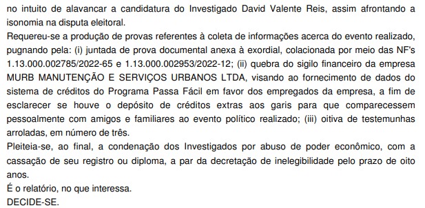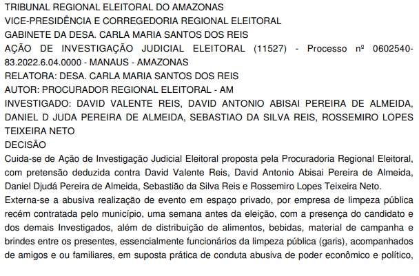 “Externa-se a abusiva realização de evento em espaço privado, por empresa de limpeza pública recém contratada pelo município, uma semana antes da eleição, com a presença do candidato e dos demais Investigados, além de distribuição de alimentos, bebidas, material de campanha e brindes entre os presentes, essencialmente funcionários da limpeza pública (garis), acompanhados de amigos e ou familiares, em suposta prática de conduta abusiva de poder econômico e político, no intuito de alavancar a candidatura do Investigado David Valente Reis, assim afrontando a isonomia na disputa eleitoral”, cita a Desembargadora Carla Maria dos Santos Reis.