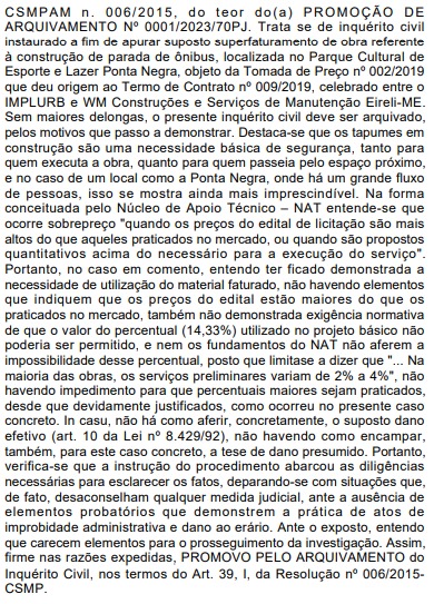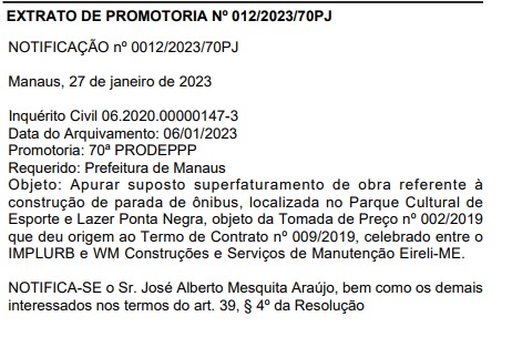 Ainda na última segunda-feira (30/1), o ex-prefeito da capital viu outra denúncia ser arquivada, dessa vez, do Ministério Público do estado do Amazonas (MP-AM). O inquérito apurava possível superfaturamento entre prefeitura e empresa contratada para obras na parada de ônibus da Ponta Negra.