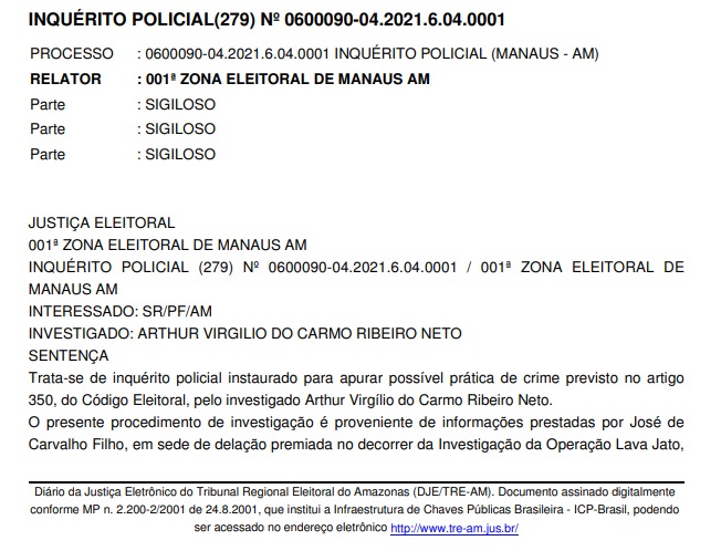Um inquérito no âmbito das investigações da Operação Lava Jato que apurava o envolvimento do ex-prefeito de Manaus, Arthur Neto (Sem partido), por suposta prática de crime eleitoral foi arquivado pela justiça eleitoral. A investigação apontava que o ex-tucano havia recebido “propina” para fins eleitorais.