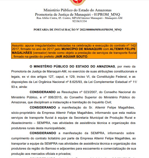 O Ministério Público do Estado do Amazonas (MP-AM) abriu um inquérito de investigação contra o prefeito do município de Manaquiri, Jair Souto, por suspeita de fraudes em licitações. Jair teria contratado a empresa de um vereador da cidade por dispensa de licitação para transporte fluvial.