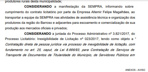 De acordo com os documentos oficiais, para abertura do inquérito o promotor Flávio Mota considerou a Constituição Federal no que diz respeito à contratações públicas. Toda contratação necessita passar por um processo de licitação de acordo com a lei Lei nº 8.666/93.