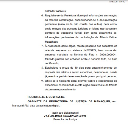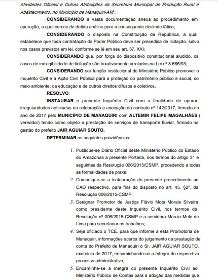 Ao Ministério Público a empresa do vereador teria confirmado que fornece transporte fluvial para a secretaria nas atividades voltadas para a assistência técnica e organização dos produtores rurais da cidade. No inquérito, o promotor solicita ao Tribunal de Contas do Estado do Amazonas (TCE-AM) que informe à promotoria, em um prazo de 10 dias, detalhes sobre as contas do prefeito referente a 2017.