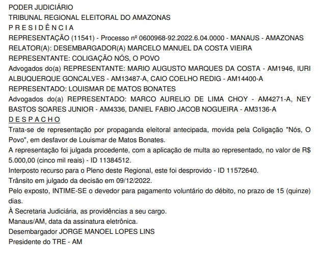 O Coronel Louismar Bonates, que foi candidato ao cargo de deputado federal pelo União Brasil em 2022, foi condenado pelo Tribunal Regional Eleitoral (TRE-AM) por irregularidades na campanha. Bonates é ex-secretário de segurança pública do Amazonas, área que atuou por 40 anos. Ele terá que pagar R$ 5 mil em um prazo de 15 dias.