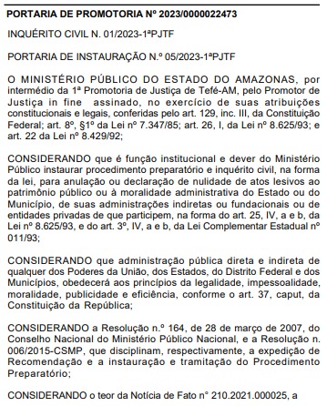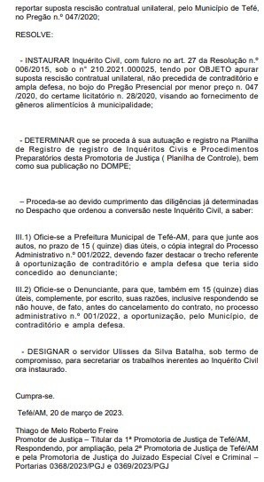O órgão de fiscalização determinou que se proceda autuação e registro na Planilha de Registro de Inquéritos Civis e Procedimentos Preparatórios desta Promotoria de Justiça (planilha de controle). A Prefeitura de Tefé tem 15 dias para apresentar defesa juntando aos autos, cópia integral do Processo Administrativo nº 001/2022 destacando o trecho que comprove que oportunizou o contraditório ao denunciante.