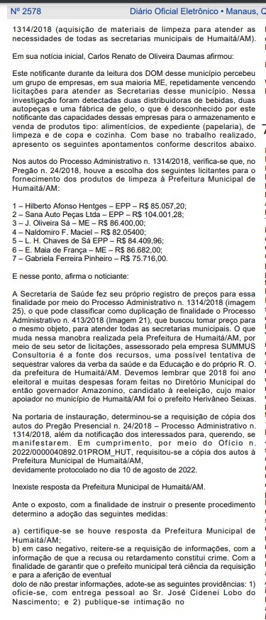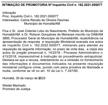 O prefeito de Humaitá, Dedei Lobo (PSC), foi notificado pelo Ministério Público do Amazonas (MPAM), que instaurou inquérito civil para apurar a prática de improbidade administrativa decorrente de fraude à licitação do Pregão Presencial nº 24/2018. O contrato era para aquisição de material de limpeza para as secretarias municipais de Humaitá.