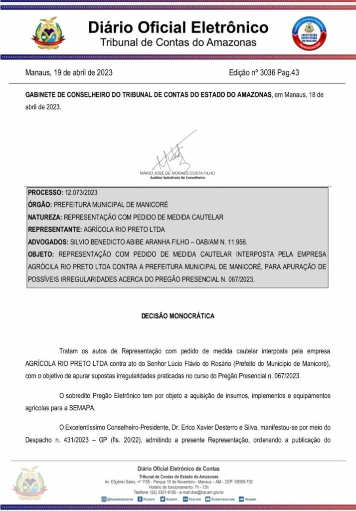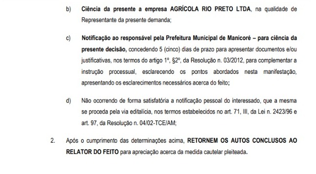 A decisão pode ser encontrada na página 43, do Diário do Tribunal de Contas do Estado do Amazonas, da ultima quarta-feira (19/04). A representação com pedido de medida cautelar foi feita pela empresa Agrícola Rio Preto LTDA.