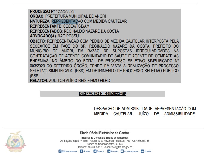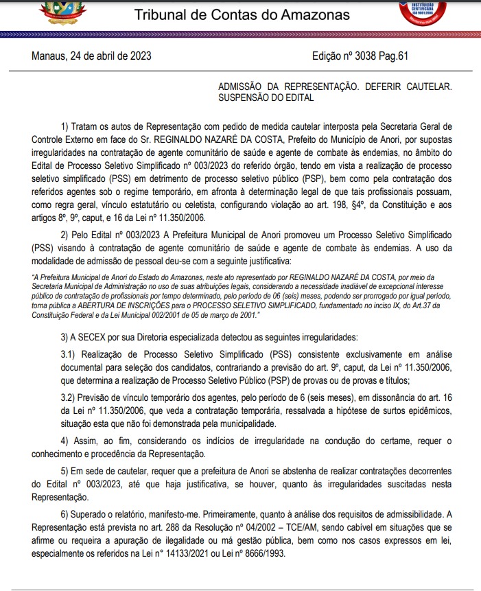 O Tribunal de Contas do Estado do Amazonas (TCE-AM) acatou uma representação com pedido de medida cautelar contra o prefeito de Anori, Regis Nazaré (Republicanos). A notificação seria por irregularidades na contratação de agente comunitário de saúde e agente de combate às endemias no Processo Seletivo Simplificado nº 003/2023 da Prefeitura Municipal de Anori, em detrimento de Processo Seletivo Público (PSP).