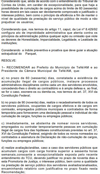 O Ministério Público do Estado do Amazonas (MP-AM) notificou o prefeito de Tefé e o presidente da Câmara Municipal da cidade, por meio de um procedimento administrativo, para fiscalizar possível acúmulo ilegal de cargos na estrutura da administração.