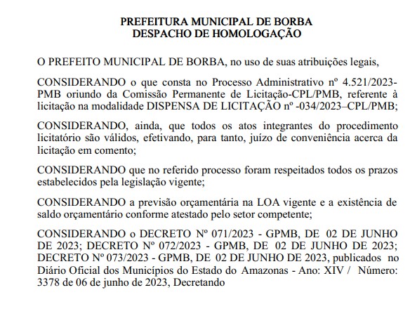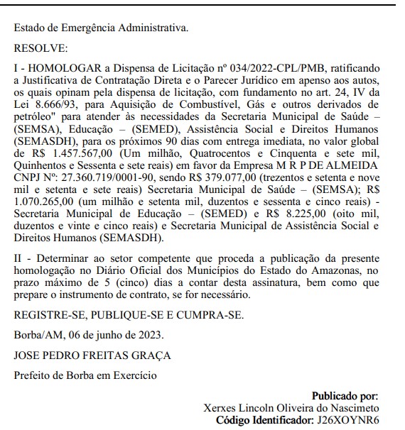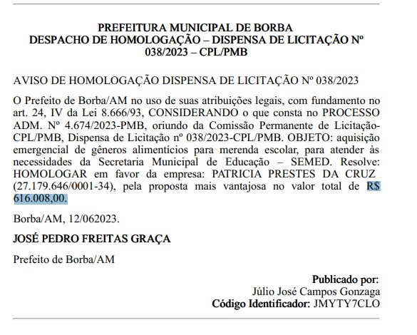 O prefeito interino de Borba (a 150.38 quilômetros de Manaus), José Pedro Freitas Graça (PSD), está no cargo há cerca de um mês após o afastamento de Simão Peixoto (PP) e já acumula um total R$ 2.073.575,00 de contratos com dispensa de licitação.