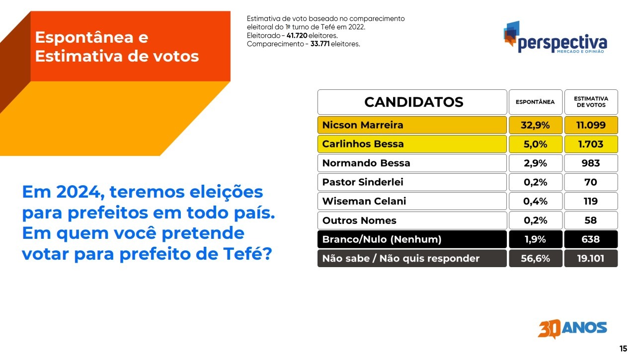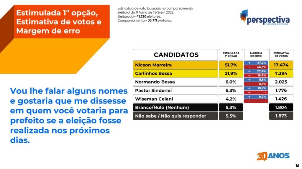 Após instabilidades em várias gestões municipais, o município de Tefé deve ter sua primeira reeleição de prefeito em mais de 14 anos. O atual chefe do executivo municipal, Nicson Marreira (PTB), possui números vantajosos em uma pesquisa eleitoral recente em relação ao deputado estadual e tefeense Carlinhos Bessa (PV), que também está cotado para disputar o cargo em 2024.