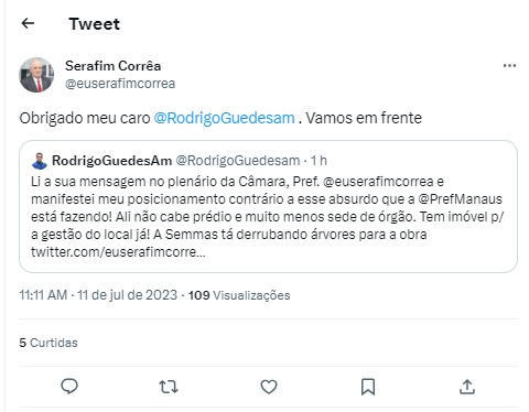 O ex-deputado estadual e ex-prefeito de Manaus, Serafim Corrêa (PSB) usou suas redes sociais para alfinetar o prefeito David Almeida. No twitter, Serafim criticou uma obra conduzida pela Prefeitura no Parque dos Bilhares.