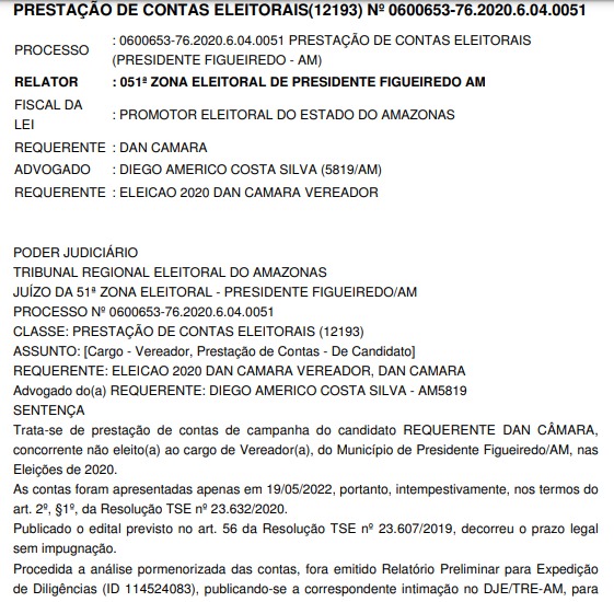 O Tribunal Regional Eleitoral (TRE-AM) reprovou as contas eleitorais do atual deputado estadual Dan Câmara (Podemos) referente às eleições de 2020, quando disputou um cargo de vereador no município de Presidente Figueiredo. O parlamentar foi intimado ainda a devolver mais R$ 14 mil aos cofres da união.