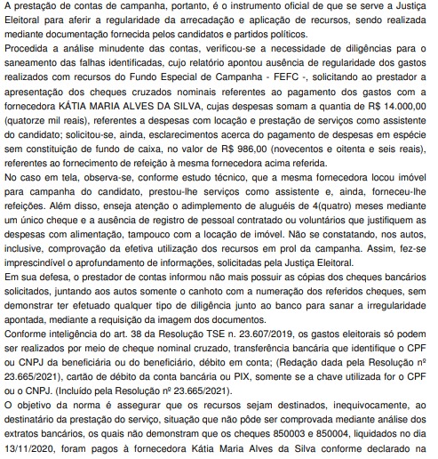 “Verificou-se a necessidade de diligências para o saneamento das falhas identificadas, cujo relatório apontou ausência de regularidade dos gastos realizados com recursos do Fundo Especial de Campanha – FEFC -, solicitando ao prestador a apresentação dos cheques cruzados nominais referentes ao pagamento dos gastos com a fornecedora KÁTIA MARIA ALVES DA SILVA, cujas despesas somam a quantia de R$ 14.000,00”, cita peça da decisão.