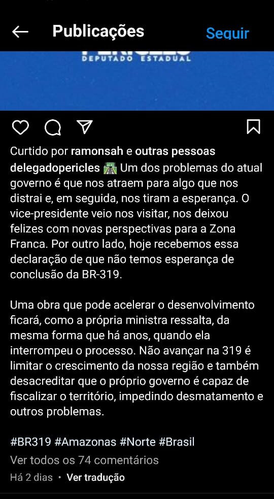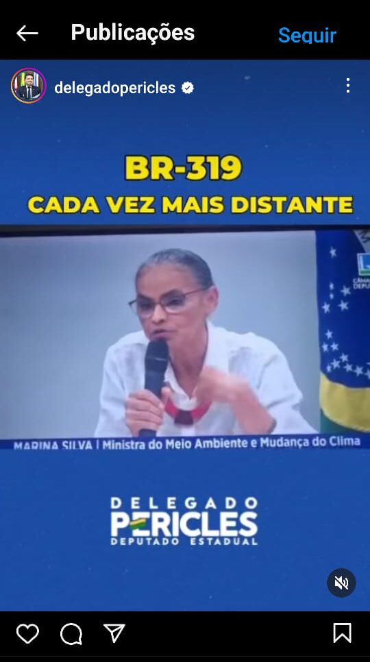 No momento em que o Amazonas é apontado como o terceiro estado mais violento do Brasil, no Anuário Brasileiro de Segurança Pública de 2023, em seus perfis nas redes sociais, o deputado estadual delegado Péricles (PL) preferiu levantar uma discussão sobre a BR-319 e resgatar falas antigas da ministra Marina Silva.