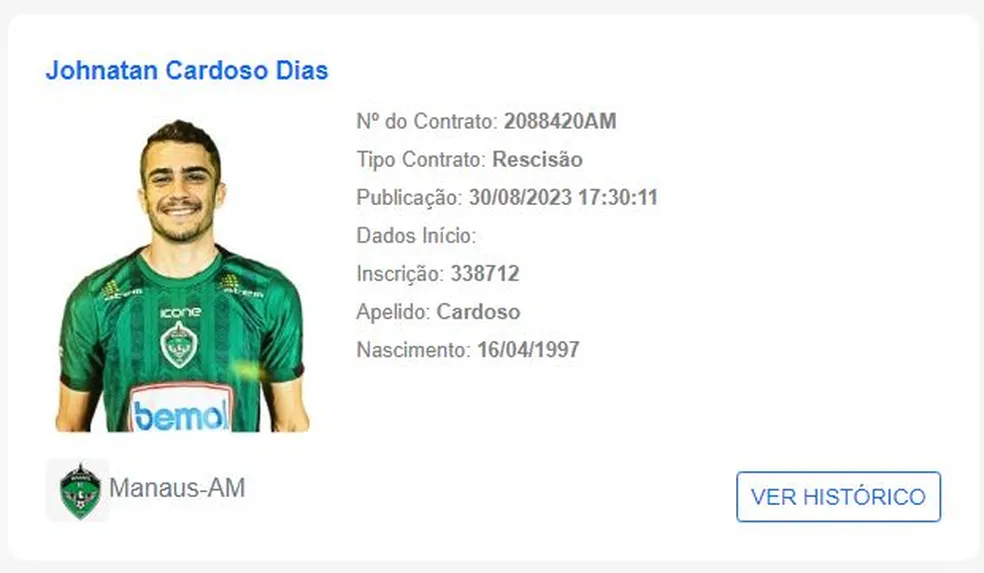 Os atacantes Johnatan Cardoso e Franklin não fazem mais parte do elenco do Manaus. Entre os dois, quem mais vezes atuou com a camisa Esmeraldina foi Cardoso. O atleta de 26 anos foi contratado no início do ano após passagem pela Aparecidense. Ao todo, foram 23 jogos disputados, entre Estadual, Copa do Brasil, Copa Verde e Série C. Ele marcou duas vezes.