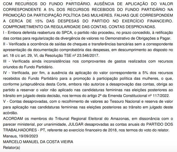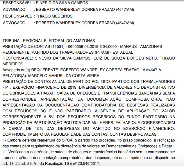 Atualmente, o PT-AM tem como presidente estadual o deputado Sinésio Campos, que foi citado no processo como responsável. A desaprovação em questão é das contas de 2018, como apontou o documento assinado pelo relator Marcelo Manuel da Costa Vieira.