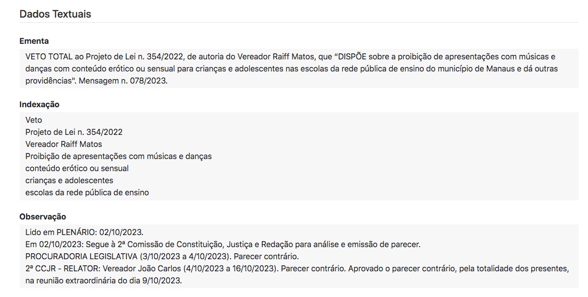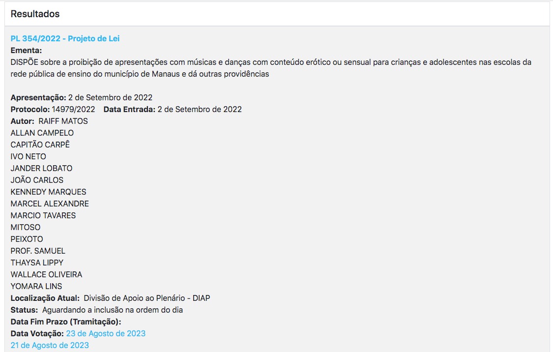 A partir da publicação no Diário do Legislativo Municipal, ficará proibida por lei a utilização de danças e músicas sensuais nas escolas de Manaus. O projeto foi aprovado na CMM no dia 23 de agosto, mas foi vetado de forma integral pela Prefeitura de Manaus no dia 21 de setembro.