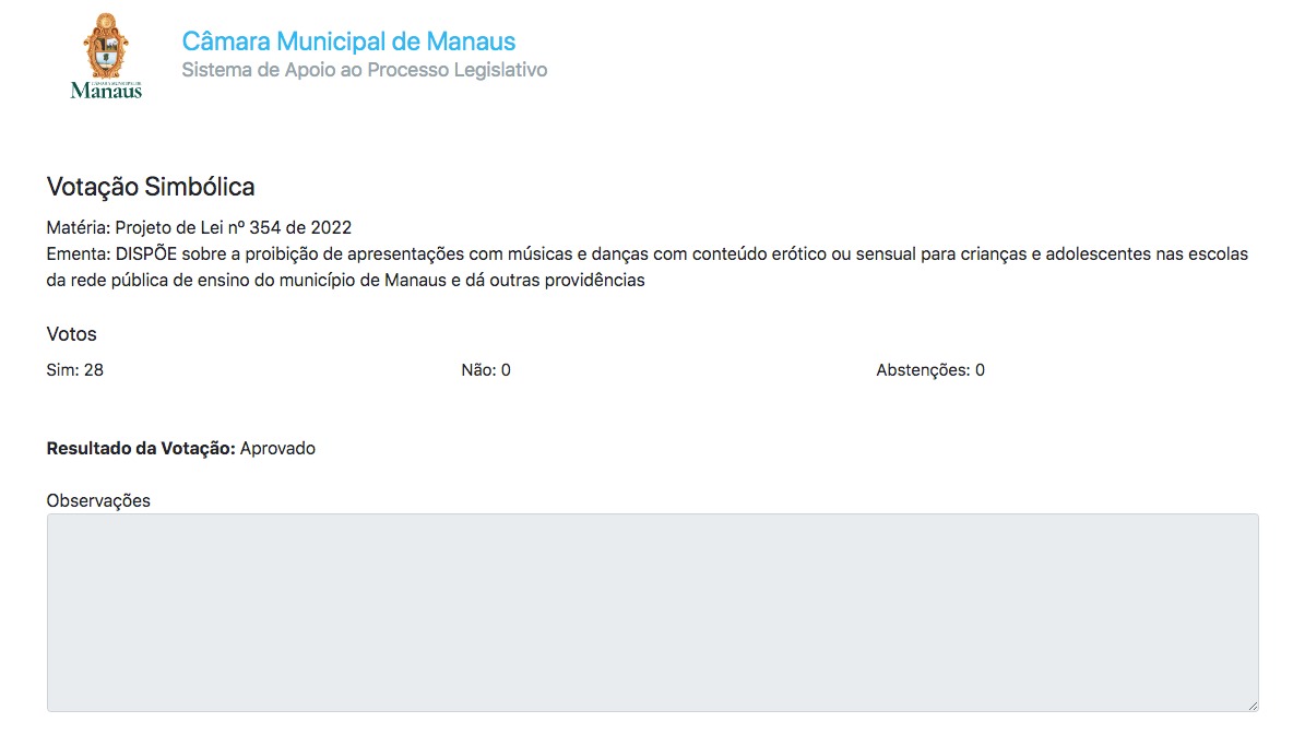 O veto total do prefeito de Manaus, David Almeida (Avante), ao Projeto de Lei (PL) 354/2022 , que proíbe danças consideradas sensuais e de conteúdo erótico nas escolas de Manaus, foi derrubado pelo Plenário da Câmara Municipal de Manaus (CMM). Em votação na plenária, 28 parlamentares foram a favor da derrubada do veto, não houve contrários .