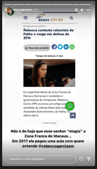 A ex-deputada federal Rebecca Garcia também se manifestou por meio das redes sociais sobre o tema. Rebecca relembrou uma reportagem em contestou o economista, quando estava a frente da Zona Franca de Manaus como superintendente.