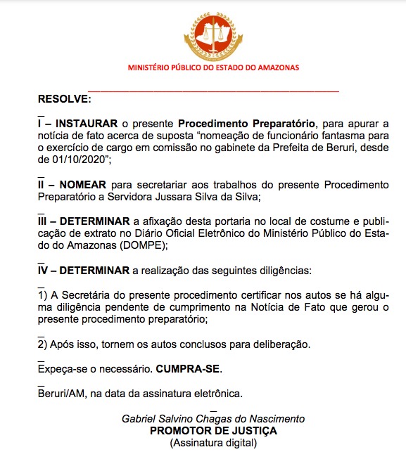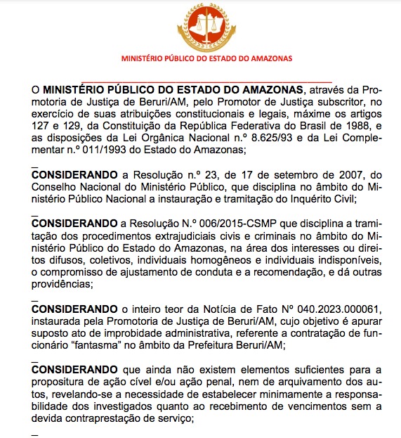 De acordo com os documentos oficiais, o inteiro teor da Notícia de Fato Nº 040.2023.000061, instaurada pela Promotoria de Justiça de Beruri/AM é “apurar suposto ato de improbidade administrativa, referente a contratação de funcionário “fantasma” no âmbito da Prefeitura Beruri/AM”, cita peça.