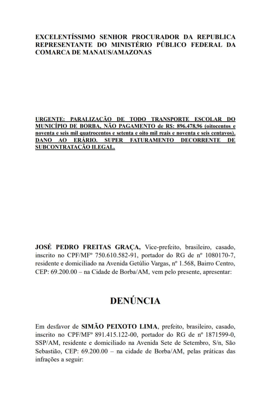 O prefeito de Borba, Simão Peixoto (PP), foi denunciado pelo vice-prefeito José Pedro Freitas Graça (PSD) ao Ministério Público Federal (MPF). O motivo é a paralisação de todo transporte escolar de Borba pela falta de pagamento de R$ 896.478,96 mil e dano ao erário, além de superfaturamento decorrente de subcontratação fiscal.