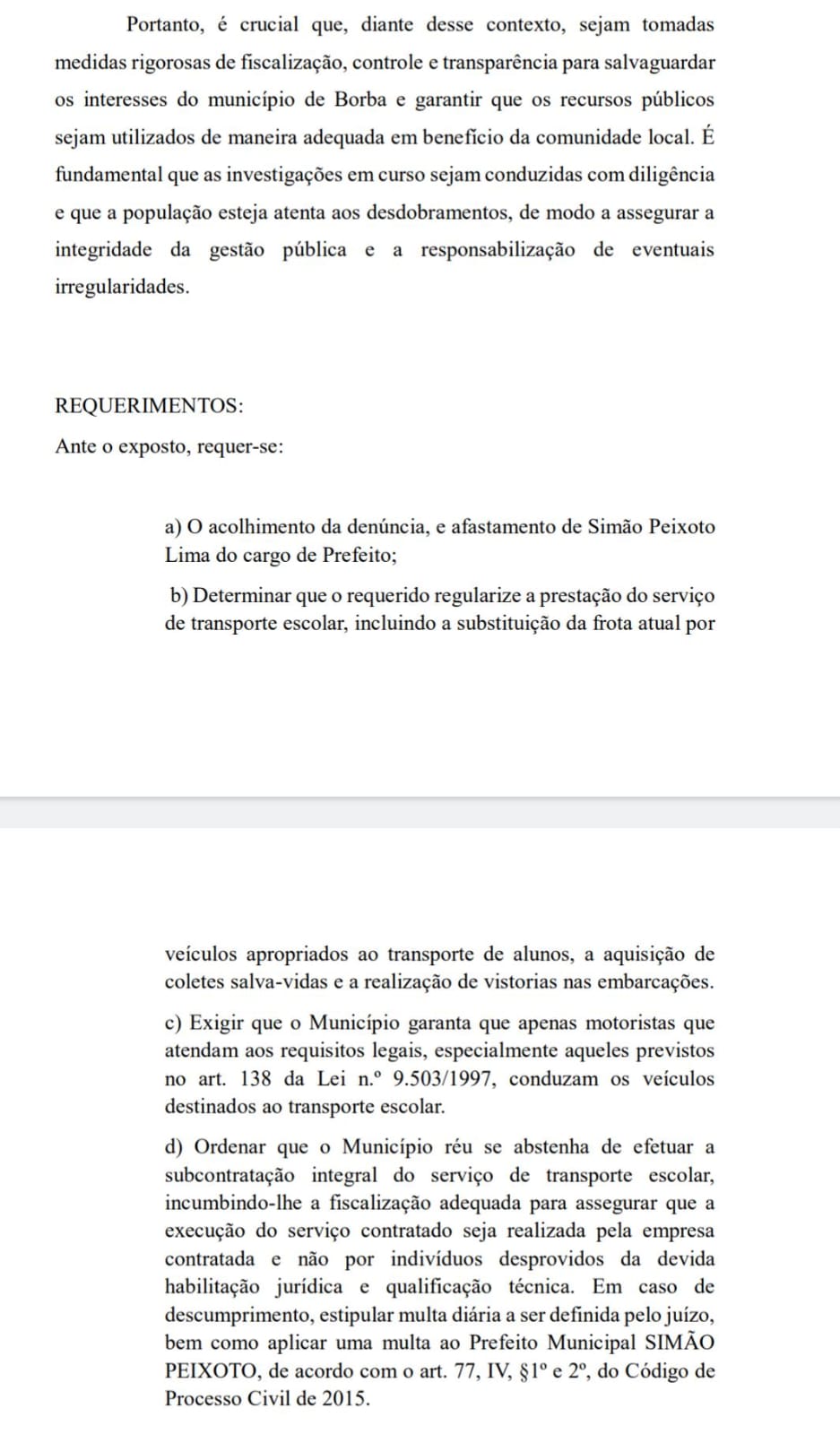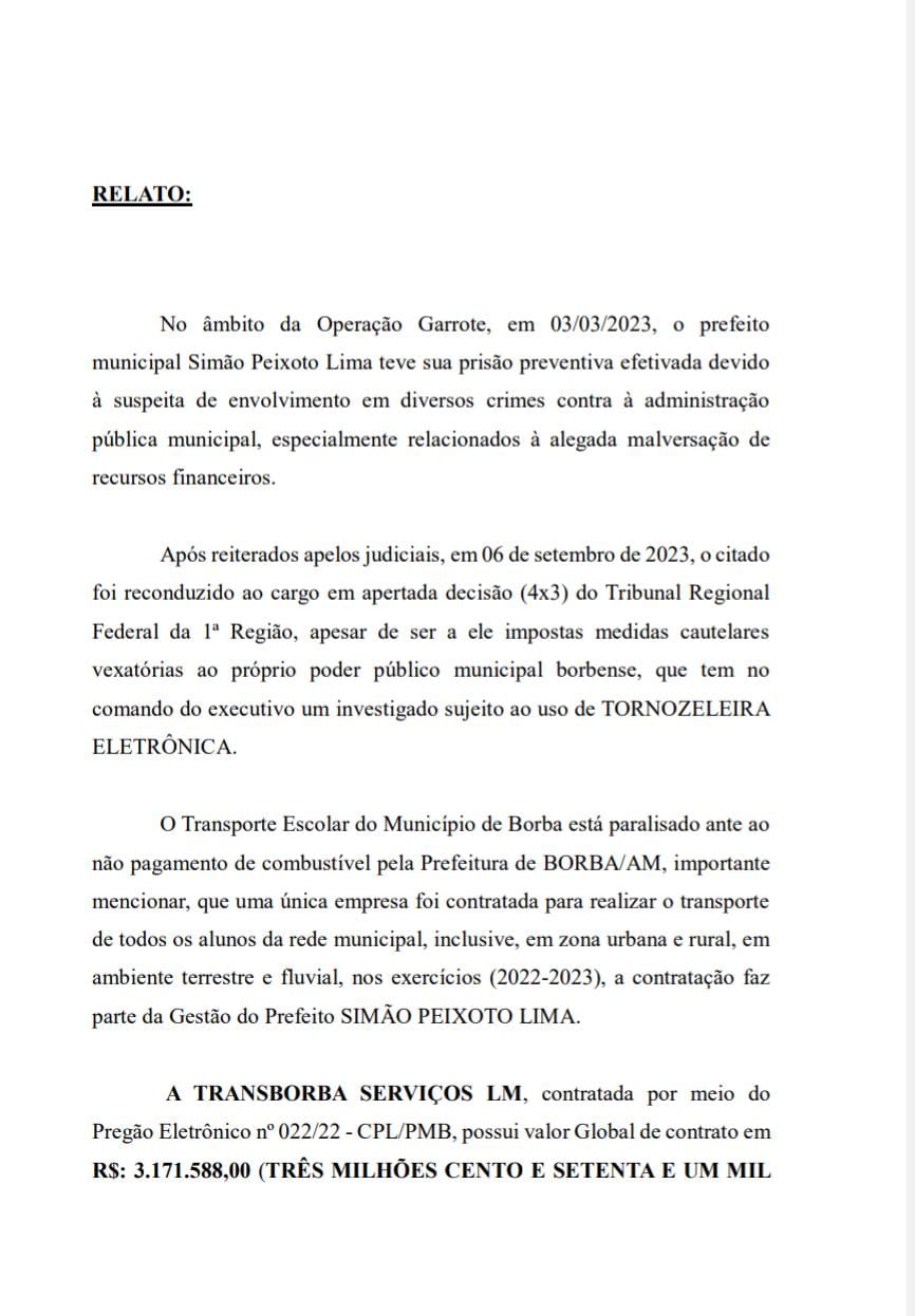 De acordo com relato enviado ao MPF, “o transporte escolar do município de Borba está paralisado ante ao não pagamento de combustível pela prefeitura de Borba, e que é importante mencionar que uma única empresa foi contratada para realizar o transporte de todos os alunos da rede municipal, inclusive, em zona urbana e rural, em ambiente terrestre e fluvial, nos exercícios de (2022-2023), a contratação faz parte da gestão de Simão Peixoto”, afirma trecho do documento.