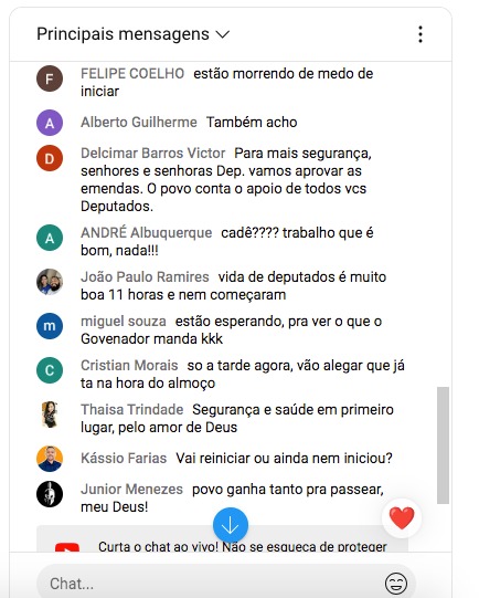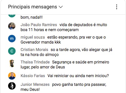 “Vida de deputado é muito boa, 11 horas e nada de começar”, comenta um internauta na sessão transmitida pelo youtube. Outro comentário sugere ainda que os parlamentares da Casa poderiam pedir suspensão da sessão devido a proximidade do horário do almoço.
