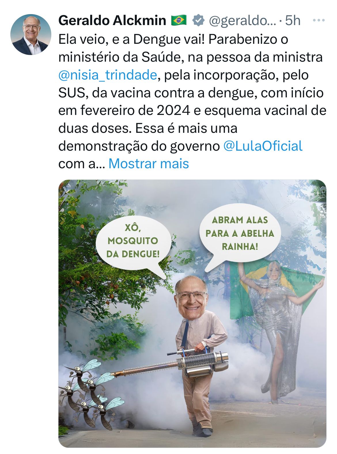 Na publicação Alckimin diz que: “Ela veio, e a Dengue vai! Parabenizo o ministério da Saúde, na pessoa da ministra @nisia_trindade, pela incorporação, pelo SUS, da vacina contra a dengue, com início em fevereiro de 2024 e esquema vacinal de duas doses. Essa é mais uma demonstração do governo @LulaOficial com a saúde e a ciência. Vamos retomar com vigor nosso programa nacional de imunização, que é referência em todo o mundo, protegendo nossa população”, publicou.