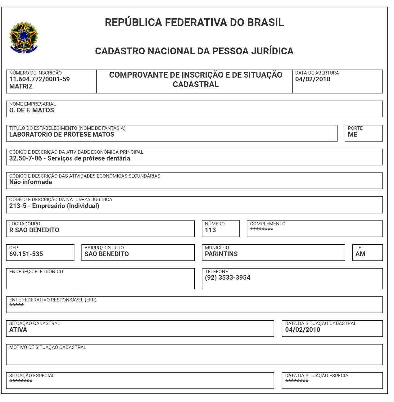 Conforme o Comprovante de Inscrição e Situação Cadastral da Receita Federal, a empresa foi criada em 2010 e tem como atividade econômica principal os “serviços de prótese dentária”.