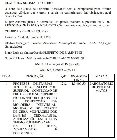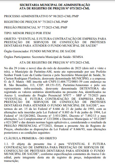 O prefeito de Parintins, Bi Garcia, assinou um Aviso de Homologação e Adjudicação do Pregão Presencial nº 077/2023 para contratar empresa para prestação de serviços de confecção de próteses dentárias para atender o Fundo Municipal de Saúde, no dia 29 de dezembro.