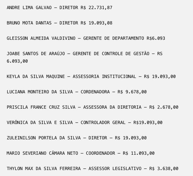 Atualmente os financiadores empregados pela Casa Legislativa possuem salários que vão de R$ 3.638,00 à R$ 22.731,87. Vale ressaltar que esses mesmos apoiadores podem voltar a “patrocinar” campanha do vereador neste ano.