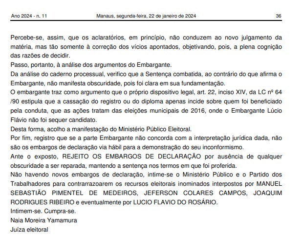 Yamamura afirma em sua decisão, publicada no Diário de Justiça Oficial Eletrônico TRE-AM, na segunda-feira (22/1), que Lúcio Flávio apenas não aceitou a interpretação jurídica dada pela Justiça Eleitoral e, por essa razão, a magistrada rejeitou o embargo de declaração movido pelo prefeito.