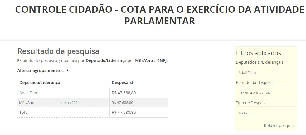 O deputado Adail Filho (Republicanos) usou R$ 47,5 mil do recurso no mês passado, quase o valor total disponível no mês, sobrando apenas R$ 1.825,12 da Ceap.