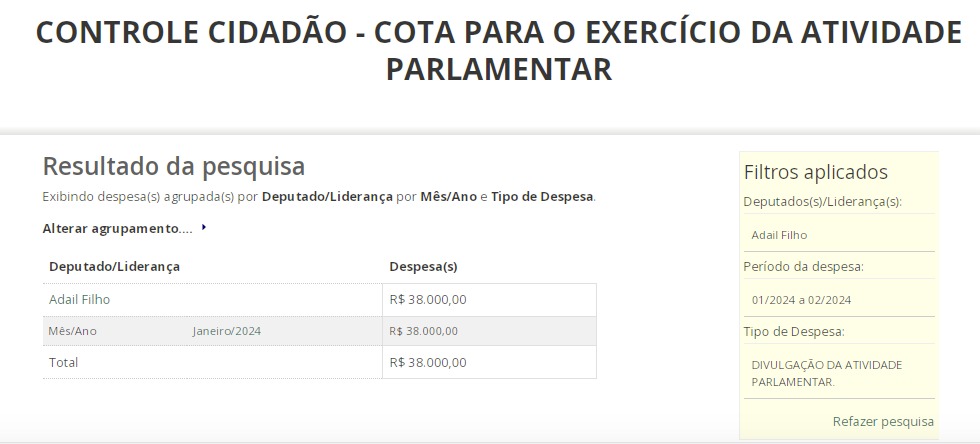 Em percentual, o deputado utilizou 96,3% do valor disponível no primeiro mês do ano. Dos R$ 47 mil gastos, 38 mil foram apenas em autopromoção por meio Divulgação da Atividade Parlamentar’.
