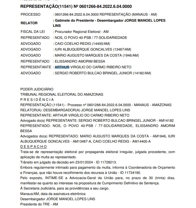 O ex-prefeito de Manaus, Arthur Neto (PSDB) vai ter que se explicar com o Tribunal Regional Eleitoral do Amazonas (TRE-AM), que acatou a Representação (11541) nº 0601266-84.2022.6.04.0000. Trata-se de representação eleitoral por propaganda irregular, julgada procedente, com aplicação de multa ao representado, no caso, Arthur Neto.