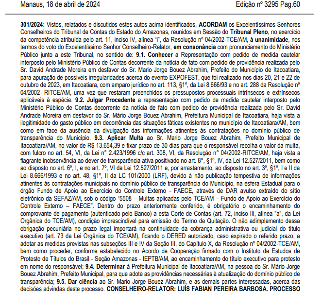 O Tribunal de Contas do Amazonas (TCE-AM) multou o prefeito de Itacoatiara, Mário Abrahim, em R$13,6 mil por falta de transparência no uso de dinheiro público para contratar serviços relacionados ao evento “Expofest”. A decisão foi divulgada nesta quinta-feira (18/4) no Diário Oficial eletrônico.