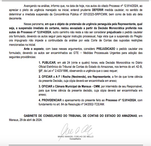 “Avançando na análise, informo que, na data de hoje, nos autos do citado Processo nº 12.814/2024, ao apreciar o pleito de urgência manejado na inicial, entendi prudente DEFERIR medida cautelar, no sentido de determinar a imediata suspensão da Concorrência Pública nº 001/2023-SRP/CMM, bem como de todo ato dela decorrente”, cita a peça.