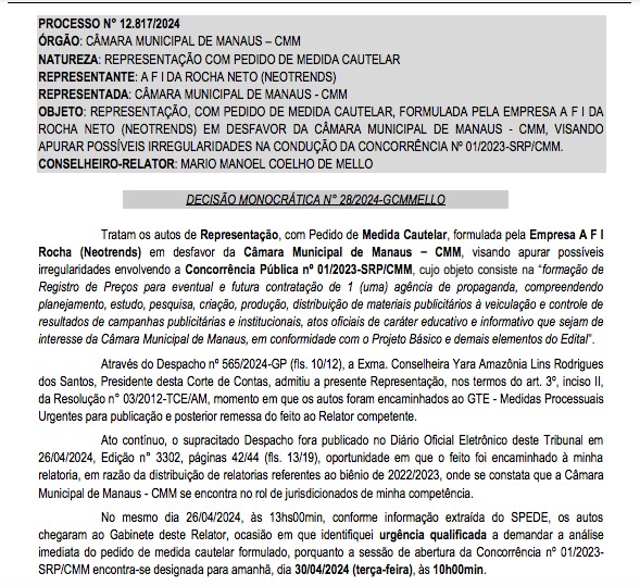 De acordo com o processo que deu origem à medida cautelar, a contratação seria realizada pela modalidade de concorrência. O Pedido de Medida Cautelar, foi formulada pela Empresa A F I Rocha (Neotrends) em desfavor da Câmara Municipal de Manaus – CMM, visando apurar possíveis irregularidades envolvendo a Concorrência Pública nº 01/2023-SRP/CMM.