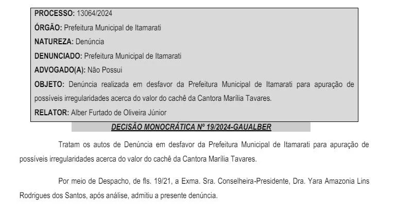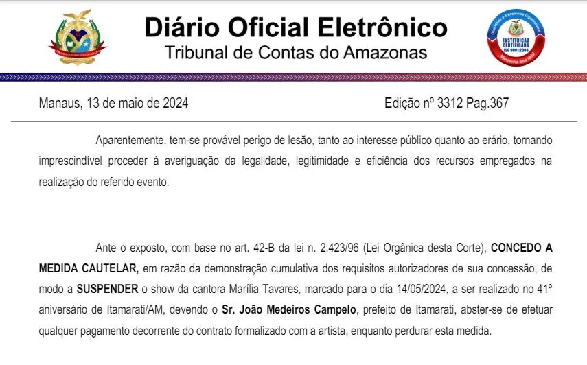 “Ante o exposto, com base no art. 42-B da lei n. 2.423/96 (Lei Orgânica desta Corte), concedo a medida cautelar, em razão da demonstração cumulativa dos requisitos autorizadores de sua concessão, de modo a suspender o show da cantora Marília Tavares, marcado para o dia 14/05/2024, a ser realizado no 41º aniversário de Itamarati/AM, devendo o Sr. João Medeiros Campelo, prefeito de Itamarati, abster-se de efetuar qualquer pagamento decorrente do contrato formalizado com a artista, enquanto perdurar esta medida”, específica o auditor no documento”, cita peça.