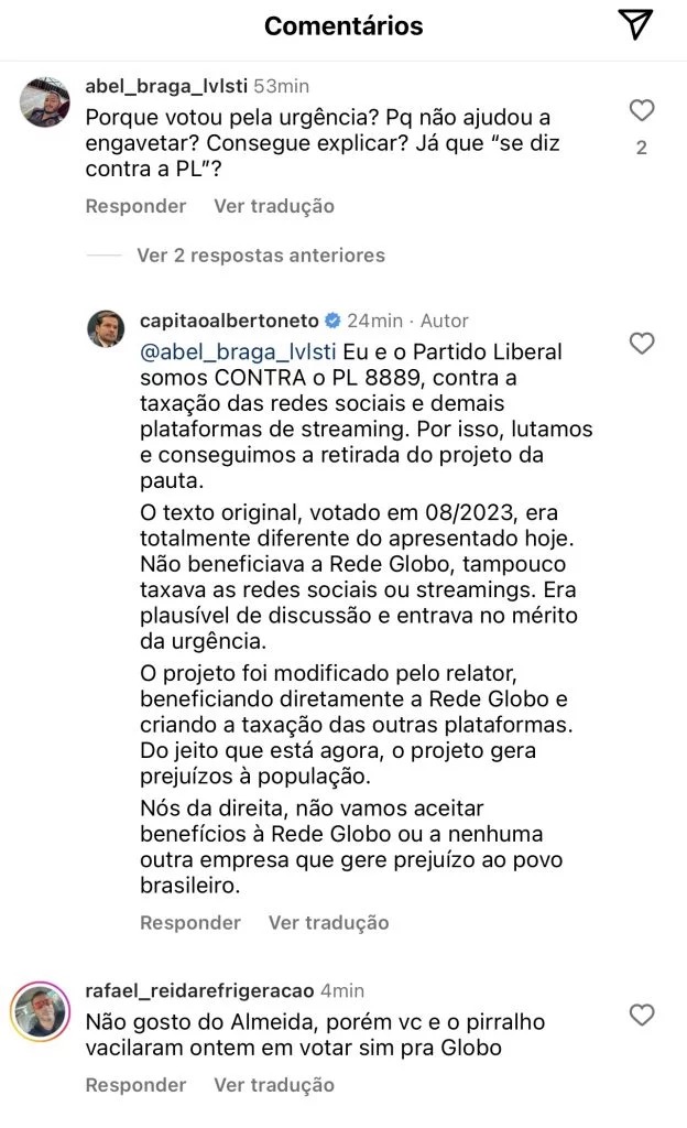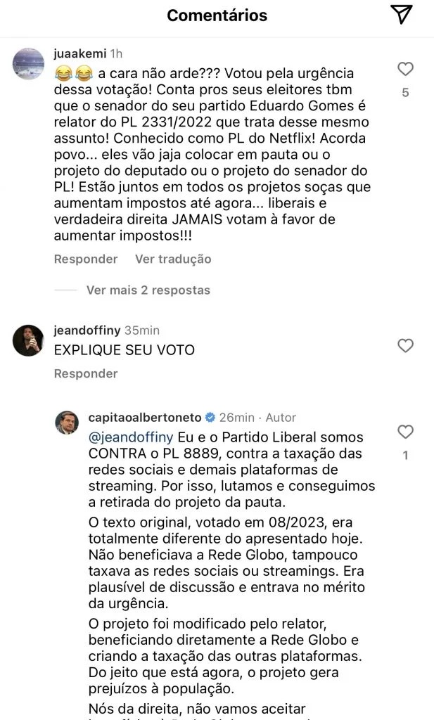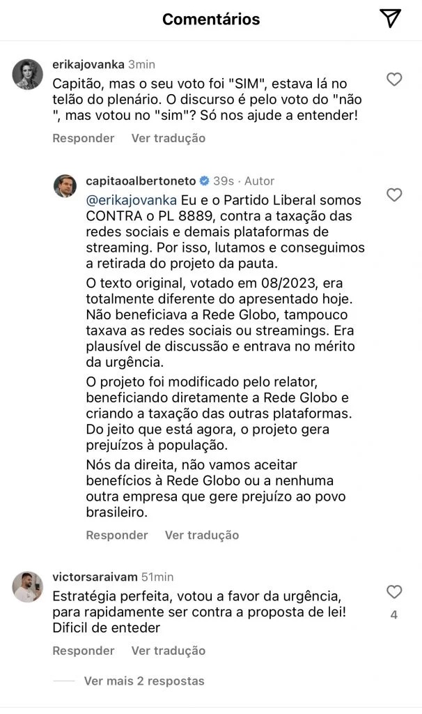 “Meu voto será CONTRA ao PL 8889 que taxa NetFlix, Youtube, Instagram, TikTok e demais plataformas streaming. Nós da direita nunca vamos aceitar mais cobranças e taxas em cima do bolso do trabalhador brasileiro”, afirma nas redes.