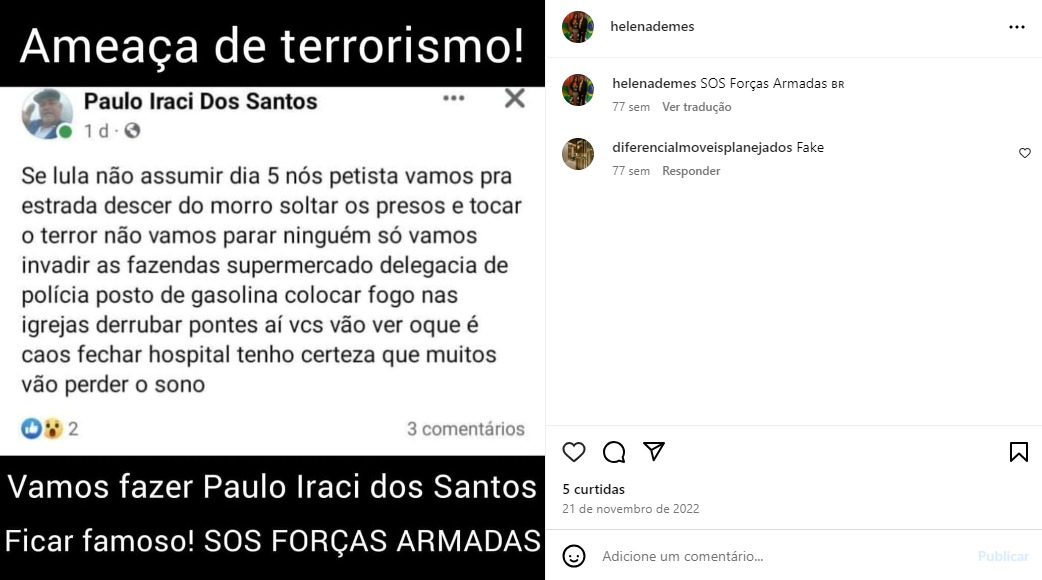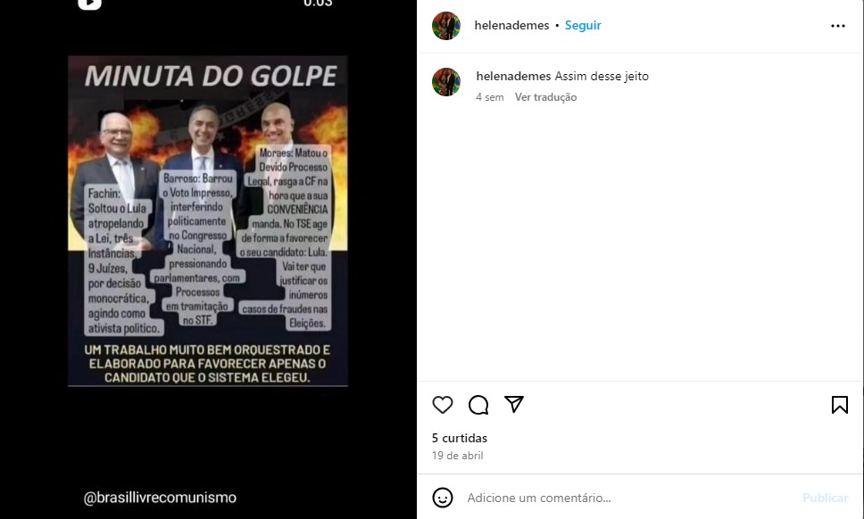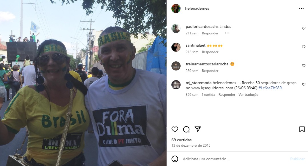 Nas redes sociais, além de constantes registros com o marido nos movimentos denominados da direita conservadora, Helena também compartilha os conteúdos de sarcasmo contra a atual gestão federal e o Supremo Tribunal Federal (STF).