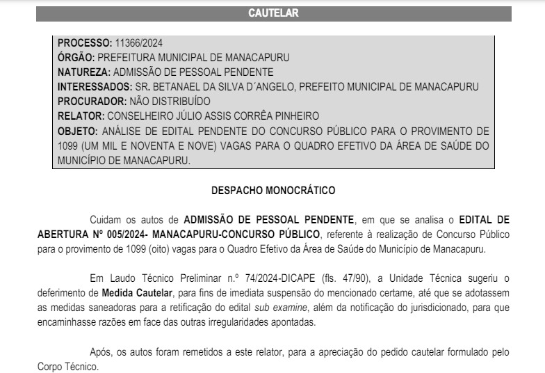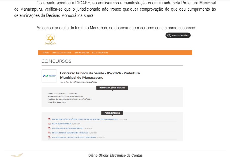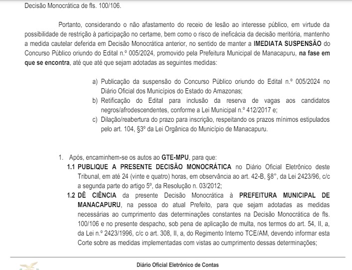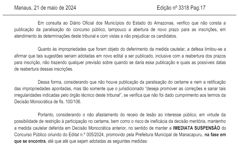 Nessa nova decisão, o relator, o conselheiro, Júlio Assis Corrêa Pinheiro, afirma que verificou o Diário Oficial dos Municípios do Estado do Amazonas e que não encontrou a publicação da paralisação do concurso público, tampouco a abertura de novo prazo para as inscrições, em entendimento às determinações feitas pelo tribunal.
