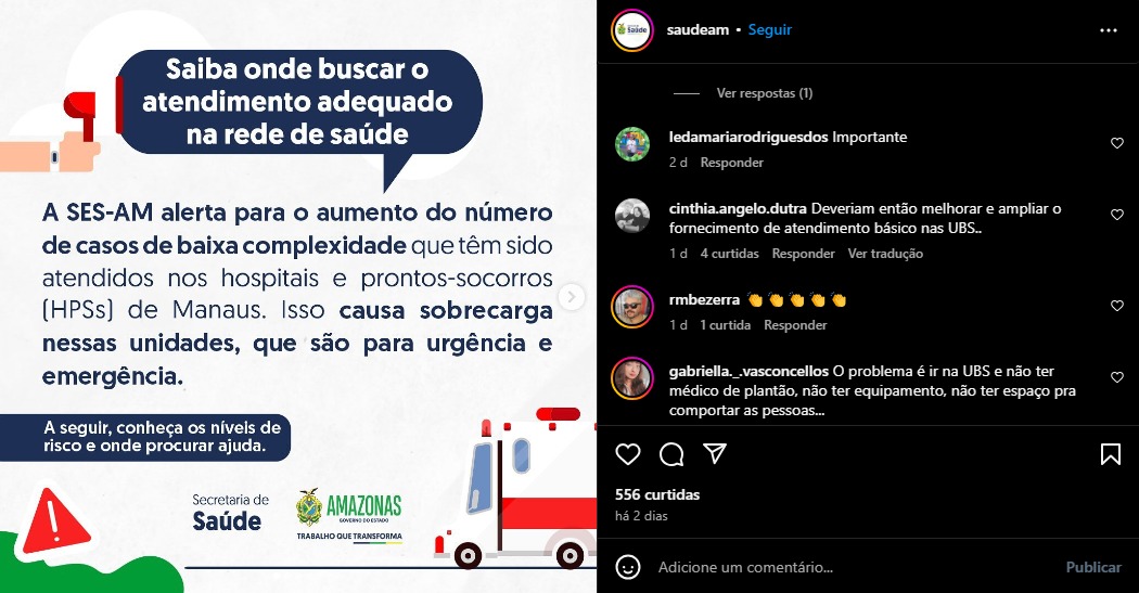 O governo do Amazonas, por meio da Secretaria de estado de Saúde (Ses-AM), fez uma publicação nas redes sociais sobre a quantidade de pessoas que estão buscando hospitais para atendimentos de “baixa complexidade”. A postagem causou revolta entre internautas, que criticaram o funcionamento das unidades e a cobertura dos serviços.