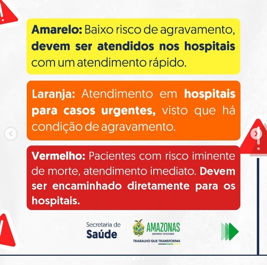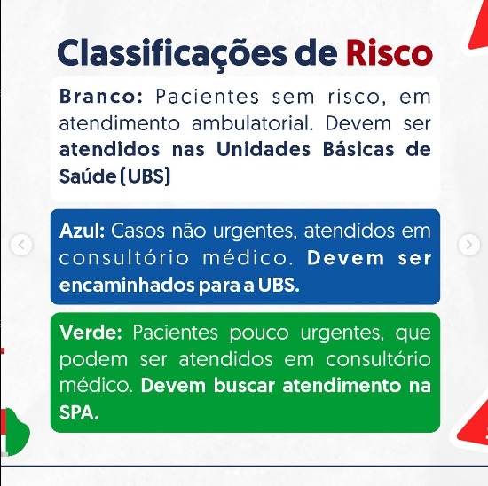Na publicação, a secretaria explica como funciona os atendimentos clínicos por complexidade de tratamento e estrutura da unidade de saúde. “Atendimento adequado no tempo de espera na rede de saúde. Veja onde ir em casos de urgência e emergência de acordo com a classificação de risco”.