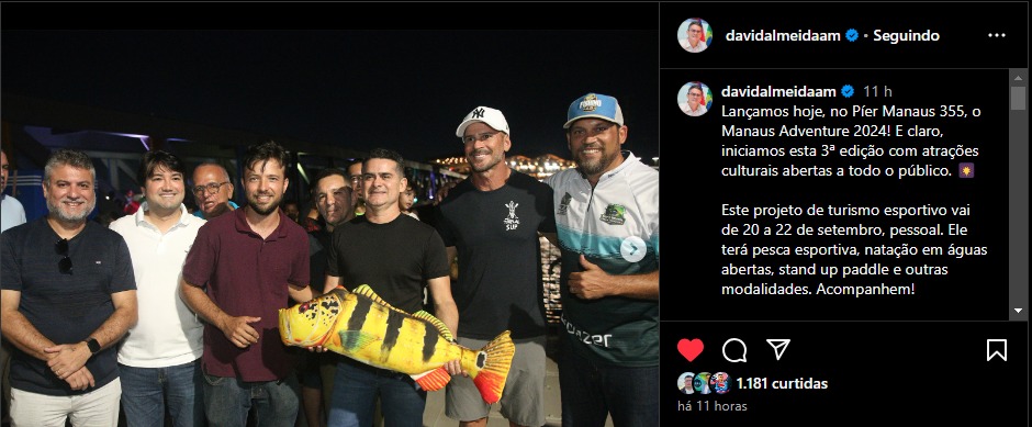 “Lançamos hoje, no Píer Manaus 355, o Manaus Adventure 2024! E claro, iniciamos esta 3ª edição com atrações culturais abertas a todo o público. Este projeto de turismo esportivo vai de 20 a 22 de setembro, pessoal. Ele terá pesca esportiva, natação em águas abertas, stand up paddle e outras modalidades. Acompanhem!”, David Almeida nas redes.