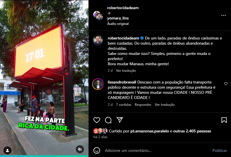 “De um lado, paradas de ônibus caríssimas e bem cuidadas. Do outro, paradas de ônibus abandonadas e destruídas. Sabe como mudar isso? Simples, primeiro a gente muda o prefeito! Bora mudar Manaus, minha gente!”, roberto cidade nas redes”, afirma nas redes.